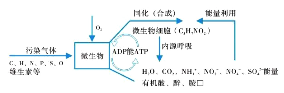 生物除臭可以表達為:污染物+O2→細胞代謝物+CO2+ H2O 污染物的轉化機理可用下圖表示: