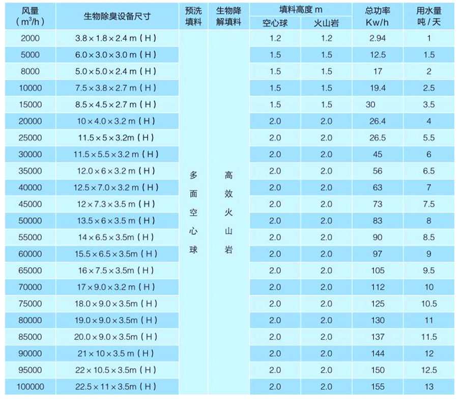 具體過程是:先將人工篩選的特種微生物菌群固定于填料上,當污染氣體經過填料表面時,微生物菌群從中獲得營養源,在適宜的溫度、濕度、pH值等條件下,能夠快速生長、繁殖,并在填料表面形成生物膜。在臭氣通過期間,有機物被生物膜表面的水層吸收后被微生物吸附和降解,得到凈化再生的水被重復使用。